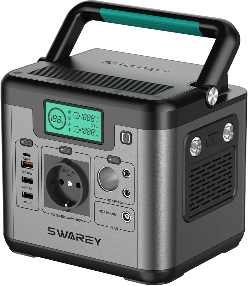 Модель SWAREY S500 має ємність 518 Вт·год (3,6 В/144 А·год або 21,6 В/24 А·год) і забезпечує стабільну вихідну потужність 500 Вт (пікова — 1000 Вт) з чистою синусоїдою. Така характеристика гарантує безпечне живлення навіть для чутливих електронних пристроїв. Пристрій стане незамінним помічником у подорожах, на риболовлі чи під час кемпінгу, дозволяючи підключати найрізноманітніше обладнання — від ноутбуків і камер до освітлення чи портативних холодильників.
